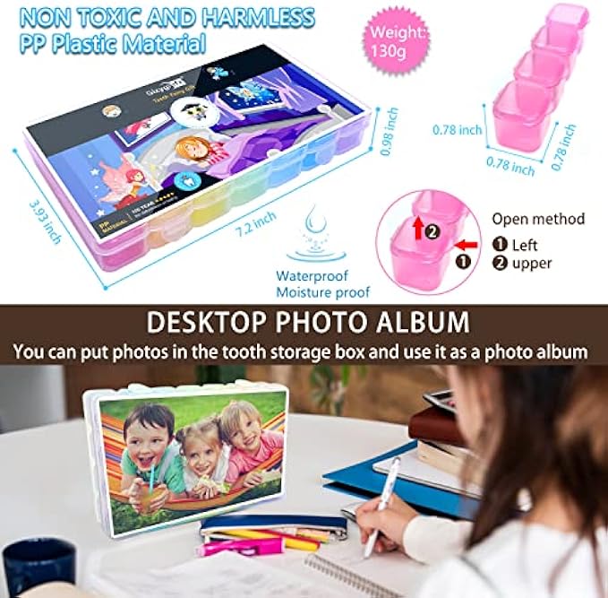 • 【TOOTH HOLDER MULTIFUNCTION】the baby first tooth box is make up of 7 colors PP material, The tooth holder is smooth. Size:7x4.1x0.9 in, Weight: 130g. It can be used as a child's photo album on the desktop, it makes a great baby tooth souvenir.