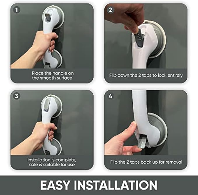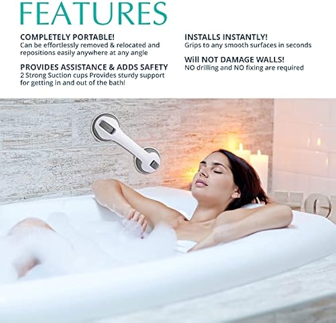 ?????????? ?????????? ① The grab bar is to be used ???? ?? ?????? and help support properly a person's body, Never apply full body weight. ② The mounting surface of the grab bar ???? be flat, non-porous, and smooth. And measure tiles and the distance between them prior to purchase as suction cups ?????? overlap the grout line. ③ Check the stability of the suction cup periodically. Use with caution and test-proof the suction of cups before use. ✅High Safety with 2 Strong Suction: This shower handle(2 Pcs) It’s a perfect bath tool that can keep safe and provide stable protection. This Shower Grab Bars for Seniors is very sturdy and durable in 2 strong suction cups with strong power, so you will have a safe experience in the bathroom, bathtub, shower, and toilet. This Handicap Grab Bars is perfect for use with Shower Chair or Shower Bench. ✅Comfortable & Non-Slip Grip: The grab bars for bathroom provides additional stability when entering and exiting the tub or shower for a comfortable experience. With Water Resistant Design, the suction grab bars for bathtubs and showers have comfortable easy to grip handles that ensure a non-slip grip for more stability and enhanced security. Suction grab bars for shower, Shower bars for elderly suction are Great Bathroom Accessories! ✅Multipurpose Sturdy Design: This handicap grab bars are suitable using for elderly & seniors, pregnant women, kids, Injured, and Handicapped People in Kitchen, Bathroom, Bathtub, shower, and toilet. Two strong shower handle design works on any non-porous and flat surface, including Smooth tiles, Lacquered wood, Marble, Metal panel, Glass, Smooth Vinyl, and Acrylic board. Clean and dry surfaces thoroughly before installation to ensure smooth, non-porous surfaces. Shower Accessories. ✅Super Portable: The shower handle can be removed or installed anywhere in a few Seconds Without Any Tools and Will Not Damage Wall! So you can take it with you while traveling and easily install it in your hotel room or guest's bathroom. Carry it wherever you need it, simply press the latch firmly or flip them to release. Grab bars for bathtubs and showers. ✅Best Gift for your family in need: As time flies, our parents needs more and more help, sometimes we couldn't help our parents or other family in need in the bathroom all the time. But this shower bar can easily and safely instead of us to provide them with safe, effective and convenient help! This is the best gift we can give them. Shower grab bars for seniors. Shower bars for elderly suction. Shower handles for elderly suction is Great bathroom accessories for shower chair.