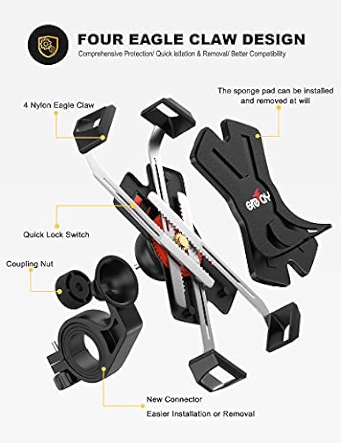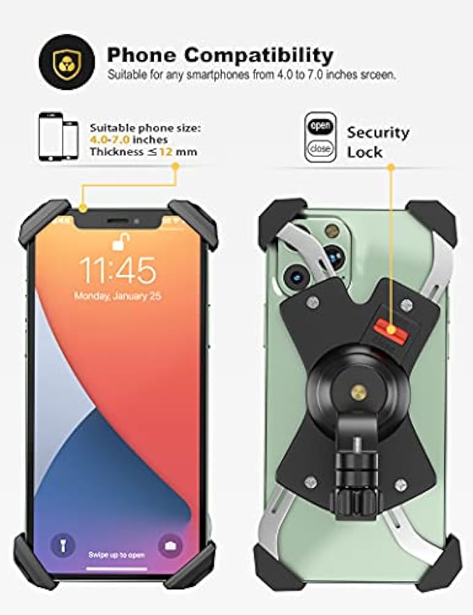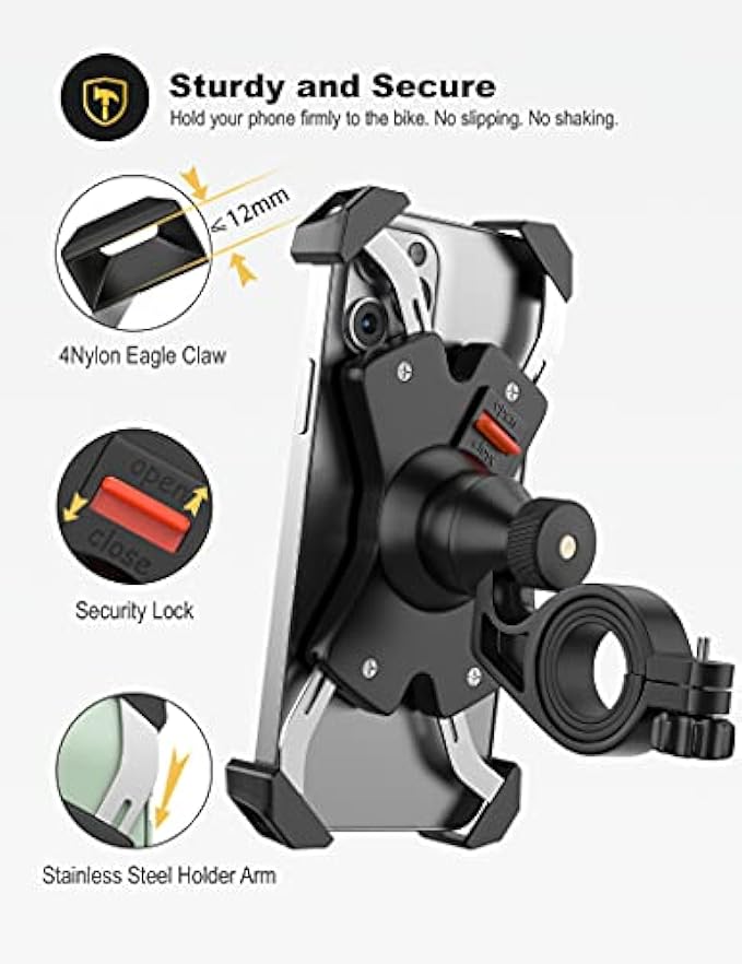 【Sturdy&Secure】The motorcycle phone mount has 4 stainless steel clamp arms, which can tightly fix each corner of the mobile phone on the bicycle holder. It is safe and steady for your cell phone even on rough road..