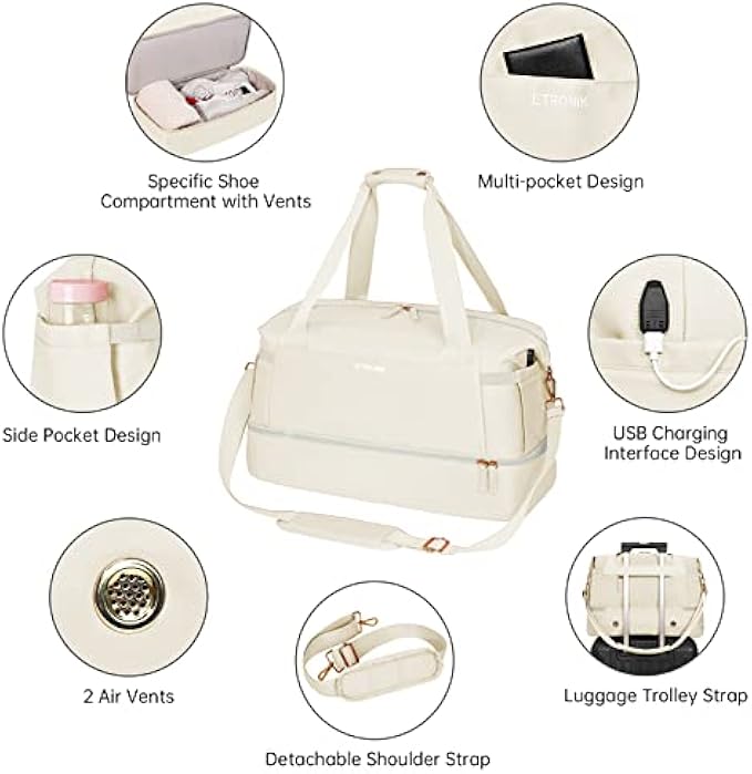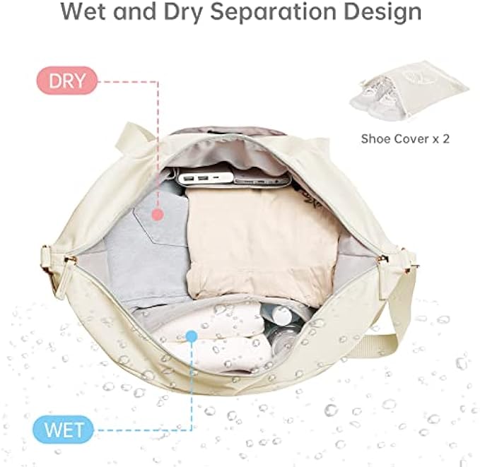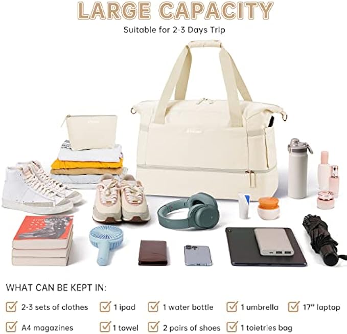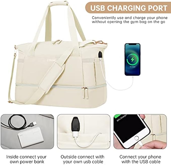 ✅【Multi-function Gym Bag】:With a USB interface, this gym bag for women offers an easy access to charge your phone on the go. Size: 18.5x14.2x8.7 inch. Large capacity and multiple pockets: 2 pockets and 1 large zippered wet bag inside. And this sports bag for women can store towels, cosmetics, iPad, clothes, food, drinks, etc. Two slip-in outer side bags for storing a water bottle or umbrella. A large pocket on the front, and a zippered pocket on the back for storing your keys. ✅【Dry Wet Separate Duffel Bag】:This duffle bag for women delivers roomy main compartment to store your clothes and items. A zippered waterproof PVC lined pocket for wet clothes or towels and swimsuits. In addition, this travel duffel bag also gives an extra small makeup bag for easy storage. ✅【Separate Shoe Compartment with Vents】:Extra shoe bag x 2. This gym bag has a separate compartment on the bottom for your shoes and dirty clothes. And the shoes compartment has 2 air vents to disperse the bad smell of shoes. ✅【Durable Construction & Removable Design】:This women weekender travel bag is made with durable and water-resistant nylon to protect your items with high quality zipper and metal button. The dual handles and adjustable, detachable shoulder straps have comfortable padding, which can reduce the pressure when carrying. There is a luggage strap on the back side of this travel bag facilitate your travel/business trip. You can also carry it as a handbag, shoulder bag or messenger bag. ✅【Wide Application Gym Bag】:A perfect choice for carrying all your gym and travel essentials. Use it as airplane travel bag, luggage bag, gym sport bag, weekend bag, carry-on bag, beach bag. Our gym bag for women is suitable for both indoor and outdoor sports, such as travel, sports, weekend trips, yoga, gym, beach, business or other daily use.