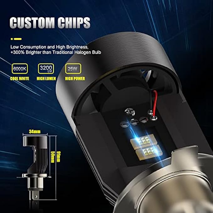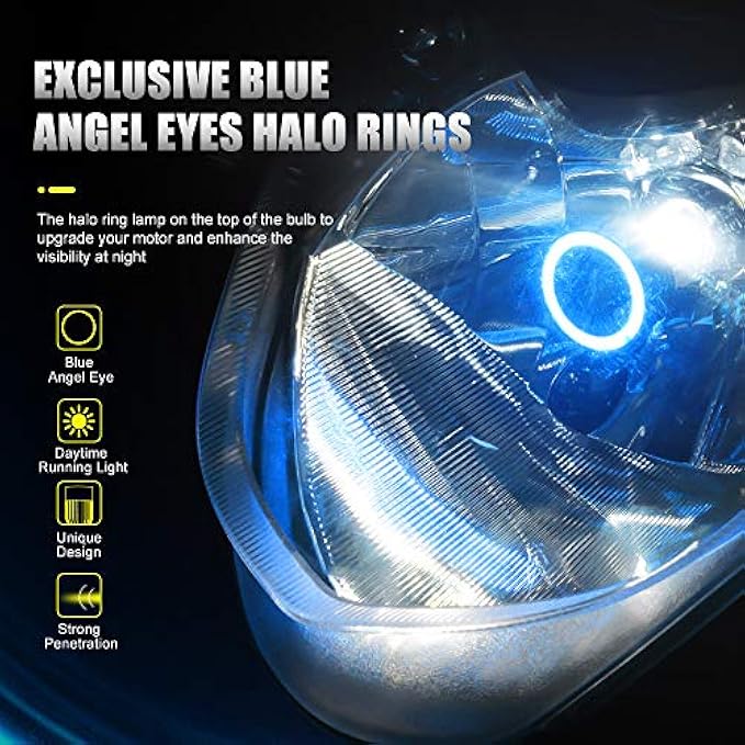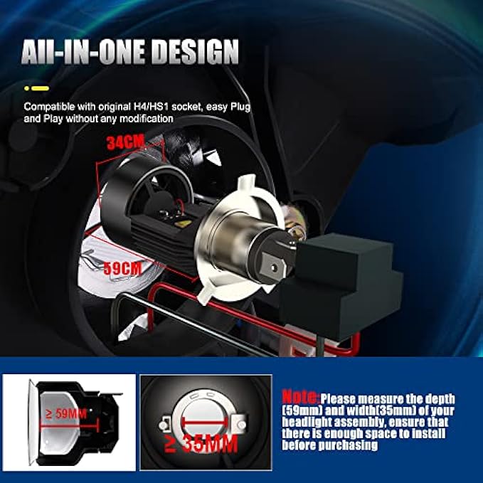 【Equipped with DRL】H4 led headlight bulb motorcycle with blue angel eye, Blue angel eye has a strong penetrating power in rainy and foggy days, The LED blue angel eye makes obvious warning to oncoming traffic, Reducing the possibility of danger, Maintains your driving safety, Angel eye is a cool decoration to your motorcycle, Makes your motorcycle look unique 【Perfect upgrade from halogens】High brightness up to 3200LM,12pcs high quality Custom chips with 25W/bulb high power, 3 times brighter than traditional halogen bulbs, Nright enough to break the dark night, No dark spots or shadowed areas, Creates longer irradiation distance and wider vision field for motorcycle riders at night 【High-efficiency Cooling System】Super powerful cooling fan with less noise,Take aircraft grade shell for fast heat dissipation, Copper substrade with excellent thermal conductivity to quickly conduct the LED heat to fans, Provides a strong cooling wind through the cooling fan to help dissipate the heat generated 【EASY TO INSTALL】Easily fit in most motorcycle, No need to change and damage the original motorcycle line, Easy to install, Plug and play, Please measure the depth(59mm) and width(35mm) of your headlight assembly beore purchasing, ensure that there is enough space to install, If you meet with light flickering etc, Please add a suitable decoder or contact us 【Perfect Service】 IP68 Waterproof Rate, No fear of severe weather like heavy rain, Snow, If you have any questions/problems about these motorcycle LED headlights, Kindly ask a question below or contact us directly