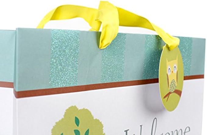 Adorable extra large gift bag to celebrate the arrival of a new baby features a deer, fox, turtle, bird and tree and text that reads "Welcome, Baby". A yellow ribbon handle, glitter accents and owl gift tag complete the package