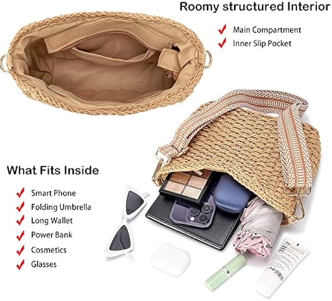 Straw Imported [Straw Crossbody Purse with 2 Removable Multicolor Strap]: The design with replacement colorful shoulder web strap and chain strap makes the retro pocketbook distinctive. It can be use a handbags, clutch, underarm bags, shoulder bags or crossbody bags according the actual need. [Handwoven and Nature Durable Material]: The fashion straw bag is made of natural straw weaving materials, which are not only environmentally friendly but also trendy and casual. Classic pattern and top zip closure that helps keep your items contained. Personalized your summer charming style. There are 6 colors (Beige, Coffee, Orange, Pink, Green, Purple) for you to choose from, which can match your different daily wear. [Cute Size & Roomy Capacity]: 9.8" * 3.1" * 7" (L*W*H), Adjustable canvas strap drop :15.7-27.5",Chian strap drop:11.8" which is perfect for holding cellphones, wallet, sunglasses, cosmetics, folding umbrella and other personal items. [Perfect Choice for Sea Beach Vacation]: Bohemian style straw hand bag are not only the best choice for seaside holidays, but also a novel and unique one that will attract a lot of attention in the street. Suitable for many occasions such as summer beach, resorts, travel, Journey, Picnic, shopping or casual daily. [Suprising Gift] The hobo side bag is the perfect gift for girlfriend, wife, and mother on any occasion like Christmas, New Year, Valentine's day, birthday, and anniversaries. It is suitable for a variety of styles of clothing. [Satisfaction Customer Guarantee]:Satisfaction or your Money Back. - We aimed to make everyone's life joyful. However, if you're not completely satisfied, then CONTACT US via Amazon. It is our intention to offer the BEST customer service.