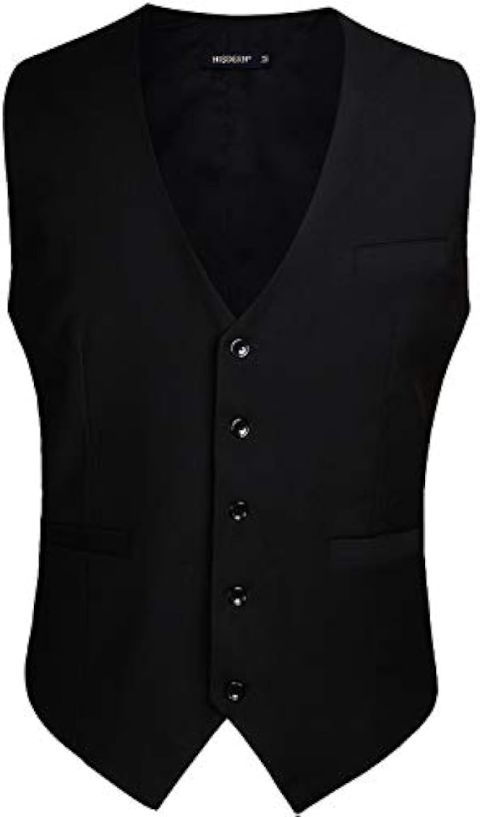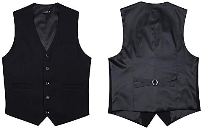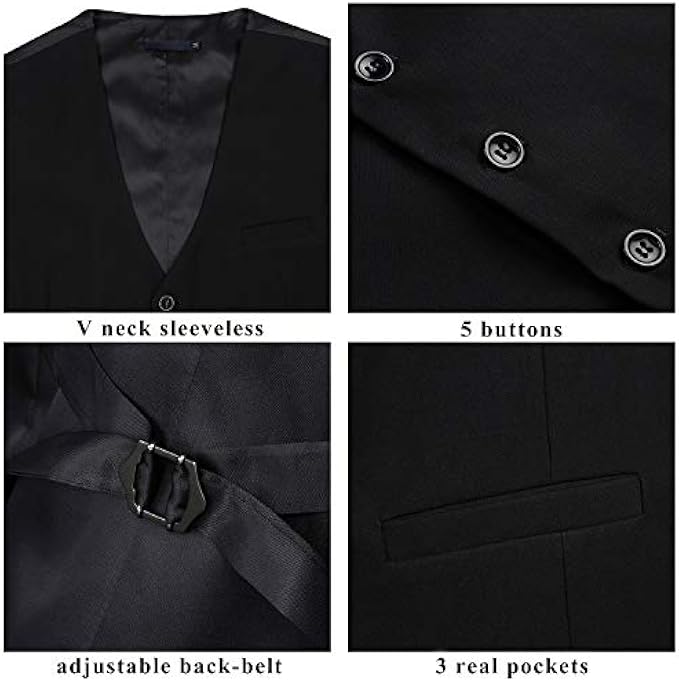 Excellent Design: Business vest is designed with classic solid color, V-neck, 5-buttons closure and 1 real pocket on the front,2 real side pockets. The back adjustable Waistcoat offers a more accurate fit, makes you stand out in the crowd and look eye-catching and handsome.