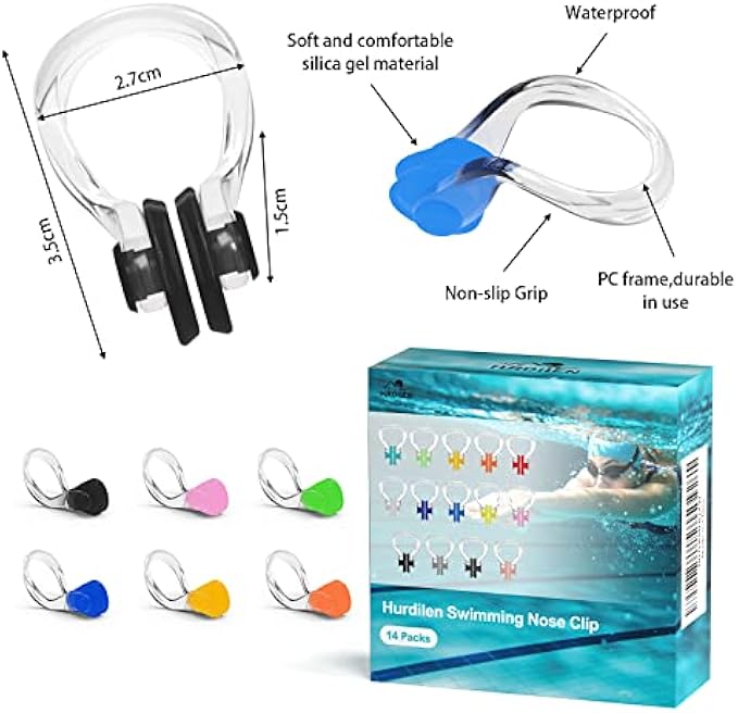 FOR ALL AGES: Hurdilen 14 pack nose clips can work as essential equipment for swimming and surfing, prevent water from entering the nose. These nose clips are comfortable and easy to use, suitable for most adult and kids but it may not fit for kids under 7 years old, because the nose clips may be too big for their nose.
