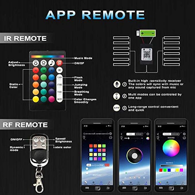 【Multifunction control】:Three choice to control your motorcycle.Mobile Phone APP Control,Download APP,phone control direct,get rid of traditional remote control.And there are IR/RF dual wireless remote controller.Enjoy cool neon light effect. Note:Only be applied to DC 12V, Red Wire (Positive) with In-Line Fuse, Black Wire (Negative).