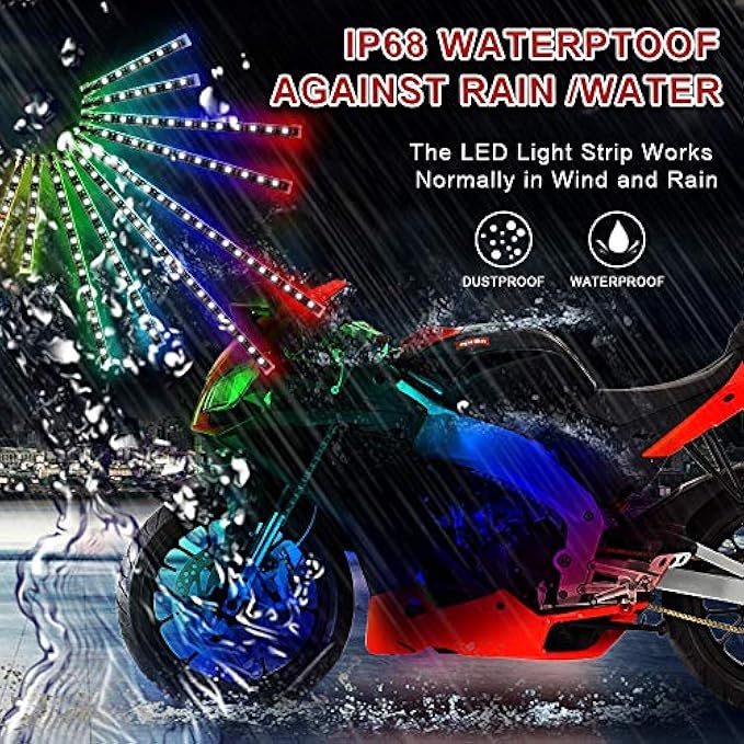 【18 RGB MULTI-COLOR 】:Our flexible motorcycle strip lights kit feature 18 RGB colors, 16 kinds of static color, 2 color cycle modes, 3 flashing modes and 1 fading mode with adjustable brightness.