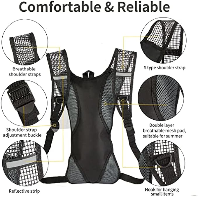 【Safety and health】: Our hydration pack backpack is made of high-quality raw materials and does not contain BPA. Give you the convenience of replenishing water while it's safe and healthy for human contact. Both the hydration bladder or the backpack can be easily disassembled and washed to keep them fresh.