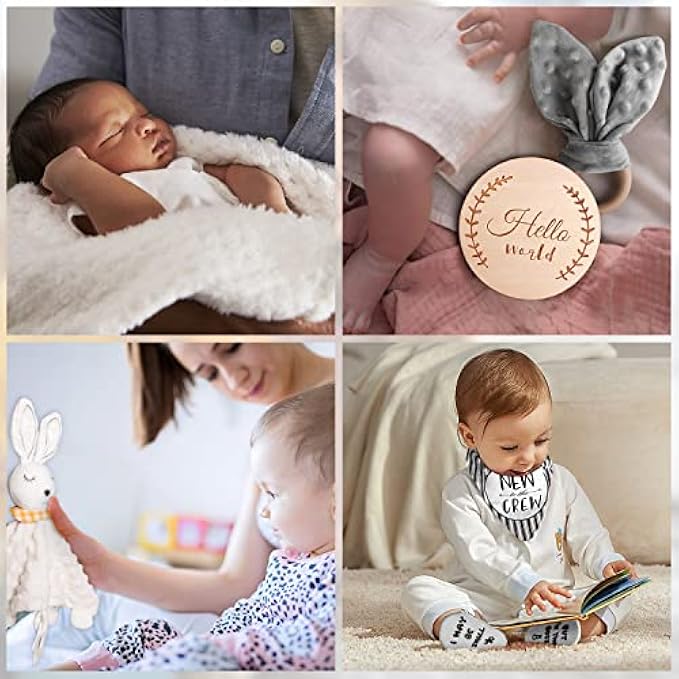 ??【Elegant Baby Gift Basket】A thoughtful baby shower gifts for new parents, includes 1 * Soft and Fluffy Baby Flannel Blanket, 1 * Lovey Bunny Security Blanket, 1* Baby Handprint Footprint Keepsake Picture Frame Kit, 1 * Bunny Baby Teething Toys, 1 * Wooden Baby Milestone, 1 * Funny Baby Bibs and Socks, 1 * "Hello World" Baby Greeting Card, 1 * Cardboard Gifts Box. Perfect gifts for newborn baby boy and girl, make gifts giving fun and easy. ???【BEST QUALITY FOR BABY】Soft flannel fleece baby blanket which is breathable, offers unbeatable softness and warm, bring a comfortable sleeping temperature to your child. Ideal for crib, stroller or for cuddle time. Baby security blanket is super comfortable and a transitional object to help babies feel safe and secure, it has a bunny head which is lovey and appealing to your little one. Whether a quick trip for shopping or bed time your little one is well taken care of. ??【BABY GIFTS FOR GIRLS BOYS】Smooth and textured natural wood teething toys, lovely chewable flexible ears and the hard wood to bit on to. Ideal size for little hands, BPA-free, and there are no burrs on the surface. 100% cotton funny baby bibs are designed with fashionable printing, easy to match your baby's outfit, bring a smile to the face of everyone who sees this. And the baby socks (6-12 months) with grip offer non-slip, round-dotted grippers to children as they crawl, walk and run. ??【SWEET MEMORIES FOR PARENTS AND BABY】Babies grow up too fast that every moment is worth recording. While enjoying the joy of becoming a parent, you can also make the first gift for your baby, takes less than a minute to create your very own DIY unique newborn baby keepsake. Pick a sweet and heartwarming milestone "Hello World" for your baby, with your baby's personal message on the back, can be applied as the lovely photo props to take adorable and memorable photos for your little one. ??【SMILES GUARANTEED】Order this wonderful neutral baby gifts for a best friend’s baby shower party, gender reveal, baby registry, birthday, first time visit gifts. Imagine yourself or your friend receiving this carefully arranged baby gift box filled with love and care and can be sure she will absolutely love the gifts! Feel free to message us through “contact sellers” if products don't meet your expectations / product quality problem, we promise a 100% full refund.
