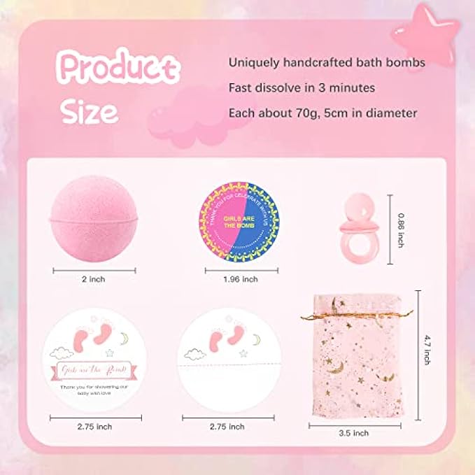 ?【BABY PARTY FAVOR FOR GUESTS】Comes with 12 pcs bath bombs baby shower favors in a paper individually wrapped, 12pcs pink organza bags, 12pcs little pacifier ornaments, 12pcs thank you DIY card, you can personalized the name month and year. Not only a cute decoration on the main table, and but also an adorable shower gift for guests.