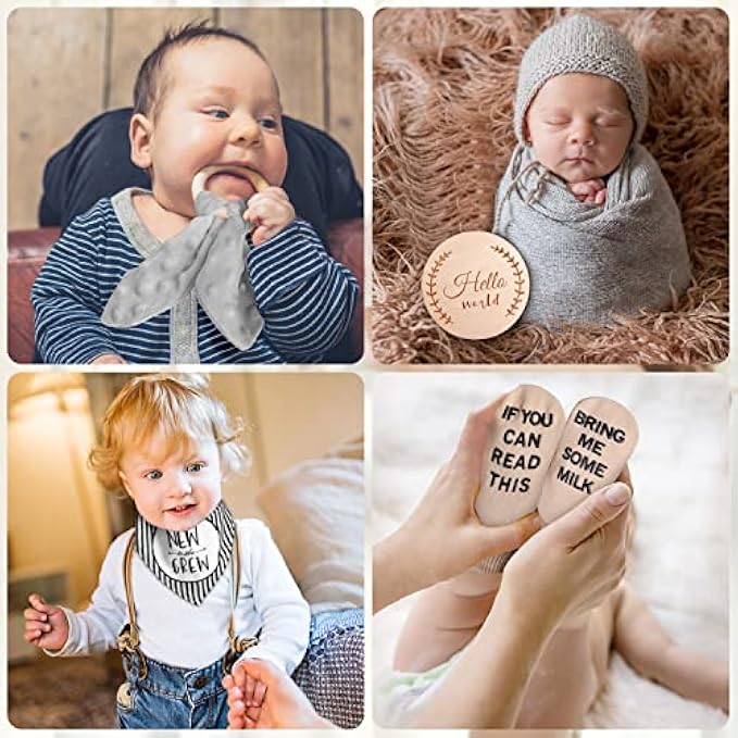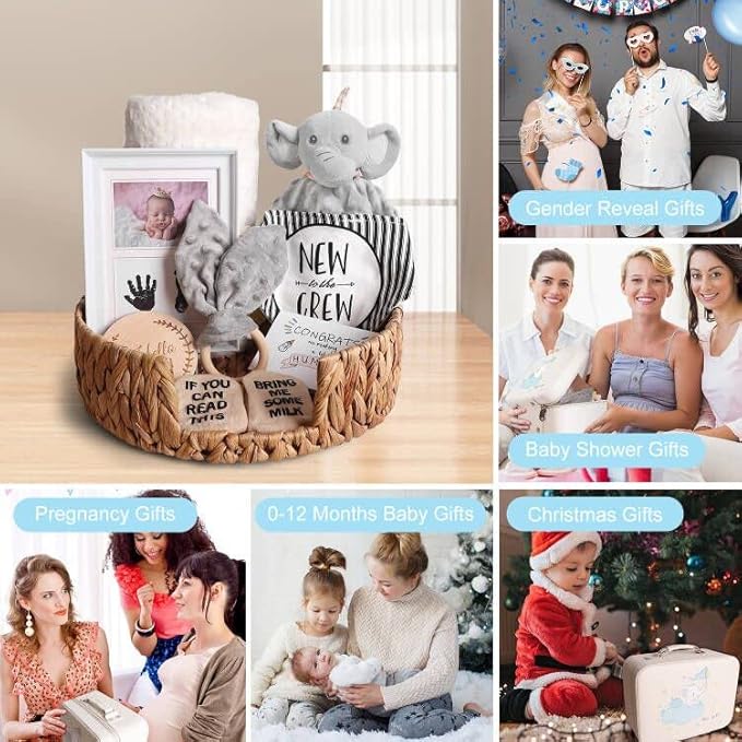 ???【THOUGHTFULLY BABY GIFTS】All the baby basket are individually created to offer an impressive array of presents for the baby. This Baby Gift Basket Includes: Flannel Baby Blanket, Baby Elephant Security Blanket, Baby Handprint Footprint Keepsake Kit, Baby Milestone, Wood Ear Ring, Baby Bibs and Socks, Greeting Card, Elephant Gift Suitcase. Imagine the joy as the parents will feel when they receive it and find filled with a selection of charming and practical gifts. ??✅【BEST QUALITY FOR BABY】Soft flannel fleece baby blanket which is breathable, offers unbeatable softness and warm, bring a comfortable sleeping temperature to your child. Ideal for crib, stroller or for cuddle time. Baby security blanket is super comfortable and a transitional object to help babies feel safe and secure, it has a elephant head which is lovey and appealing to your little one. Whether a quick trip for shopping or bed time your little one is well taken care of. ??【NEWBORN GIFTS SET】Smooth and textured natural wood teething toys, lovely chewable flexible ears and the hard wood to bit on to. Ideal size for little hands, BPA-free, and there are no burrs on the surface. 100% cotton funny baby bibs are designed with fashionable printing, easy to match your baby's outfit, bring a smile to the face of everyone who sees this. And the baby socks (6-12 months) with grip offer non-slip, round-dotted grippers to children as they crawl, walk and run. ??【SWEET MEMORIES FOR PARENTS AND BABY】Babies grow up too fast that every moment is worth recording. While enjoying the joy of becoming a parent, you can also make the first gift for your baby, takes less than a minute to create your very own DIY unique newborn baby keepsake. Pick a sweet and heartwarming milestone "Hello World" for your baby, with your baby's personal message on the back, can be applied as the lovely photo props to take adorable and memorable photos for your little one. ??【SMILES GUARANTEED】Order this wonderful neutral baby gifts for a best friend’s baby shower party, gender reveal, baby registry, birthday, first time visit. Imagine yourself or your friend receiving this carefully arranged baby gift box filled with love and care and can be sure she will absolutely love the gifts! Feel free to message us through “contact sellers” if products don't meet your expectations / product quality problem, we promise a 100% full refund.