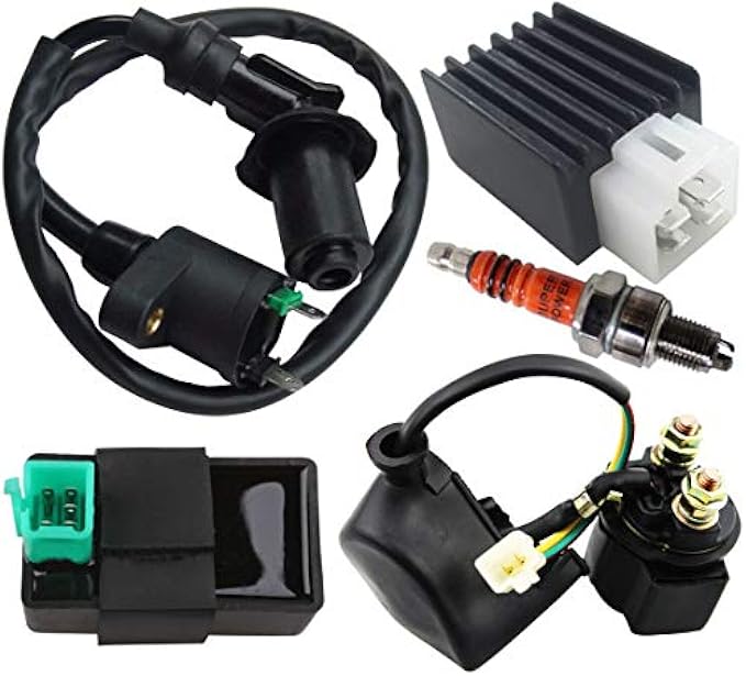 • Package contain parts:Ignition Coil + 5 PINS CDI module + 4-pin Voltage Regulator Rectifier + Solenoid Relay + 3 electrode spark plug.The item fits for 50cc 70cc 90cc 110cc 125cc horizontal engine,not for GY6 or CG engine.