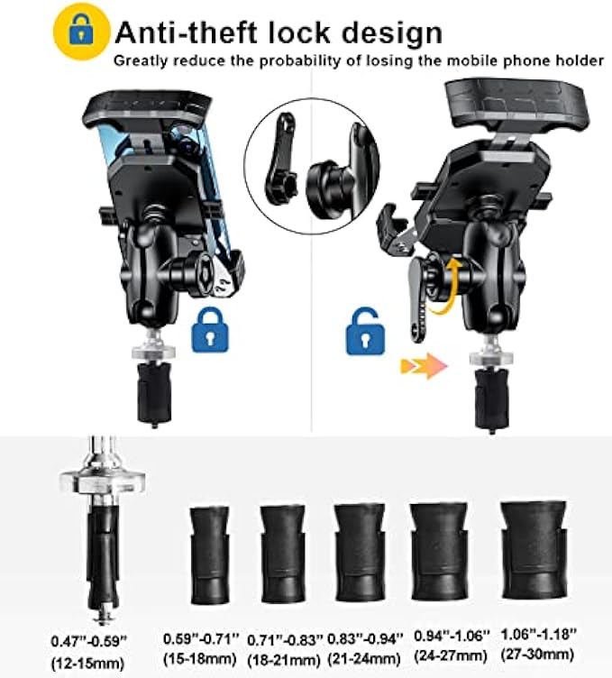 • ➤Anti-Thief Lock & One-Hand Operation: one-click to lock your phone tightly instantly, the motorcycle fork stem phone holder makes sure the mobile secure even on bumpy roads; the clamping feet extending through the retractable modules, people can operation with one hand; with anti-theft knob and key, it dispels your worries about leaving this phone mount outside. The motorbike fork stem ball phone mount makes operation super easy during ride, and prevents being stolen when not in using.