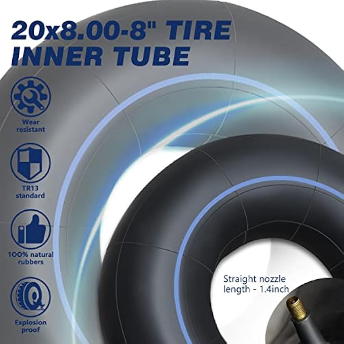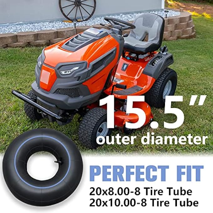 APPLICABLE TIRE SIZE -- Fit 20x8.00-8, 20x10.00-8 tire / wheel, fit vehicles with 8" rims that are between 8.0" to 10.0" wide, also a replacement tube for 18x6.50-8, 18x7.50-8, 18x8.50-8, 18x9.50-8, 20x8.50-8, 20x9.00-8, 19x7-8'' (Contact with us in time if you have any questions about size) WIDE COMPATIBILITY -- Improvedhand 20x8.00-8 inner tube fits for lawn mowers, tractors, hand trucks, wheelbarrows, dollies, trolleys, wagons, garden / utility flat carts, yard trailers, snow blowers, perssure washers, air compressors, wood chippers,generators,etc HIGH QUALITY -- Improvedhand inner tube with TR13 standard valve stem is made of premium 100% natural rubbers, dependable and durable. It is tested by several processes before leaving the factory to ensure the quality of the tires SAFETY -- High quality inner tube makes it perfect to keep you safe in any season or weather condition, premium materials can prevent damage, destruction and injury to the rider WARRANTY 100% -- Any reason of quality or compatility within 30 days, contact us getting refund, you can feel a 100% confident buy and enjoy a 24 hours pro tech online help any time
