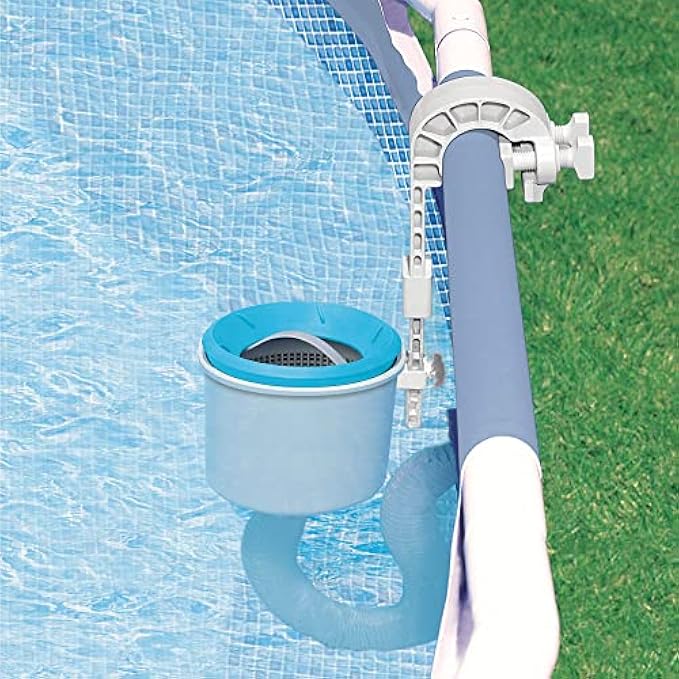 • The skimmer easily mounts to Easy Set or metal frame pool sidewalls with an adjustable bracket and attaches to the filter pump for automatic skimming.