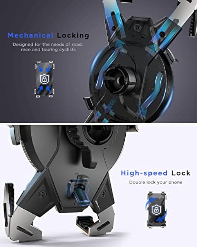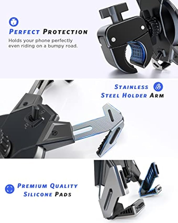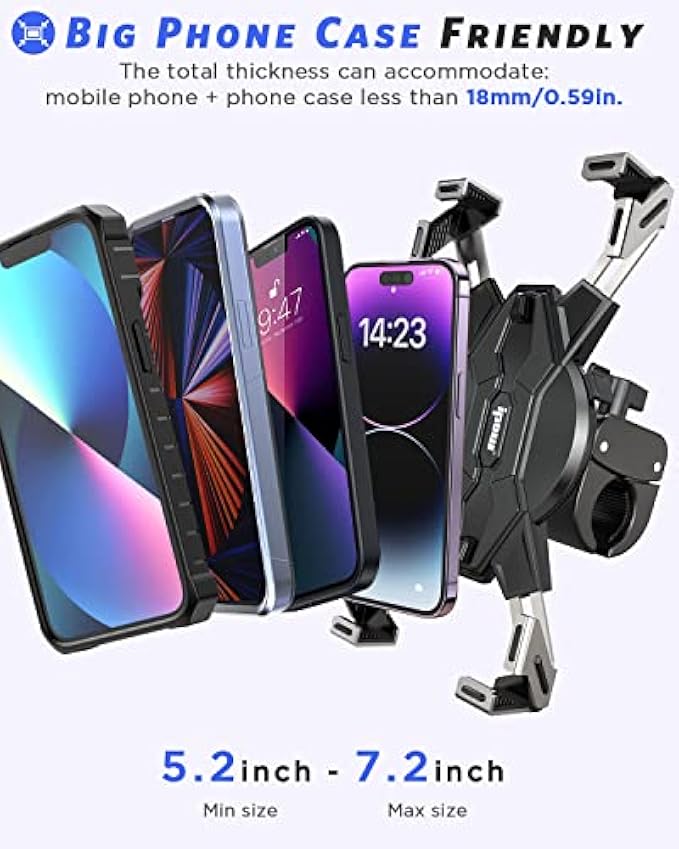 【?1s Lock & 2-step Lock】Industry unique gear structure for perfect lock your phone. Turn the knob counterclockwise to enlarge the width of the phone clip, put your phone in, then 1S Auto Lock to grip your phone. Has a high-speed lock switch, you can double lock your phone when you ride at bumpy road. No worry your phone will vibrate loose when you hit 100mps. IPOW bike phone holder gives you an easy and safe ridding journey.? 【?Clamp-on Design, 5s to Quick Install】The universal bike phone holder has upgraded handlebar clip, makes the installation easier. Hold your handlebar like a vise. No tools are needed. ?♂️ The handlebar clip is suitable for bike, bicycle, motorcycle, electric scooter, stroller, shopping cart, indoor bike, treadmill. With high-density silicone padding the clamp, it increases the grasp force over bumps, and protect your handlebar from scratching. 【?Thick Case & Big Phone Friendly】 This motorcycle phone holder is wide compatibility, can fits all 2.3 - 3.54" wide phones, like phones diagonal size in 4.7 - 7", such as iPhone 14/ 13/ 12/ 11 Pro Max, Pro, Mini, iPhone 14 Plus, iPhone Xs Max, Xs, XR, X, iPhone SE, Galaxy S23 Ultra/ S23+/ S23/ S22/ S21/ S20 and more. ❗ The max thickness the phone clip can holds is 0.59". 【?Multi-protection, Solid Grip Force】 The motorcycle phone holder is fully improved with triple-layer phone protection. First, 4 solid arms serve as a 4 points lock to every corner of your phone, phone is fixed still in the mount. Second, your phone is fully wrapped by thick premium paddings, effectively dampen all vibration to your phone camera. Third, has a security lock lever, double lock the spring-arms, so your phone won’t pop out when you go over curbs or cruising down the highway. 【?No Block Camera, 360° Rotation】 The motorcycle phone mount adopts 4 points lock design, doesn't block the phone's camera. Support photo shooting and video recording in cycling. Easy to adjust the cellphone to horizontal or vertical screen. The adjustable bike cell phone mount comes with 360 degrees rotating ball, allows you to adjust your cellphone to the horizontal or vertical viewing angle during riding. It is convenient to answer the phone, play music, GPS positioning during the riding.