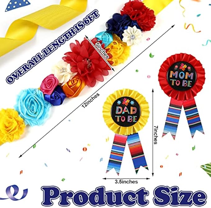 One Size Fits Most: the baby shower sash belt is approx. 31.5 inches in length, which can be adjusted to fit most people; The mom to be dad to be corsage pins are approx. 7 x 3.5 inches; The mom to be sash is approx. 31.5 x 3.7 inches, which is suitable for most expectant parents