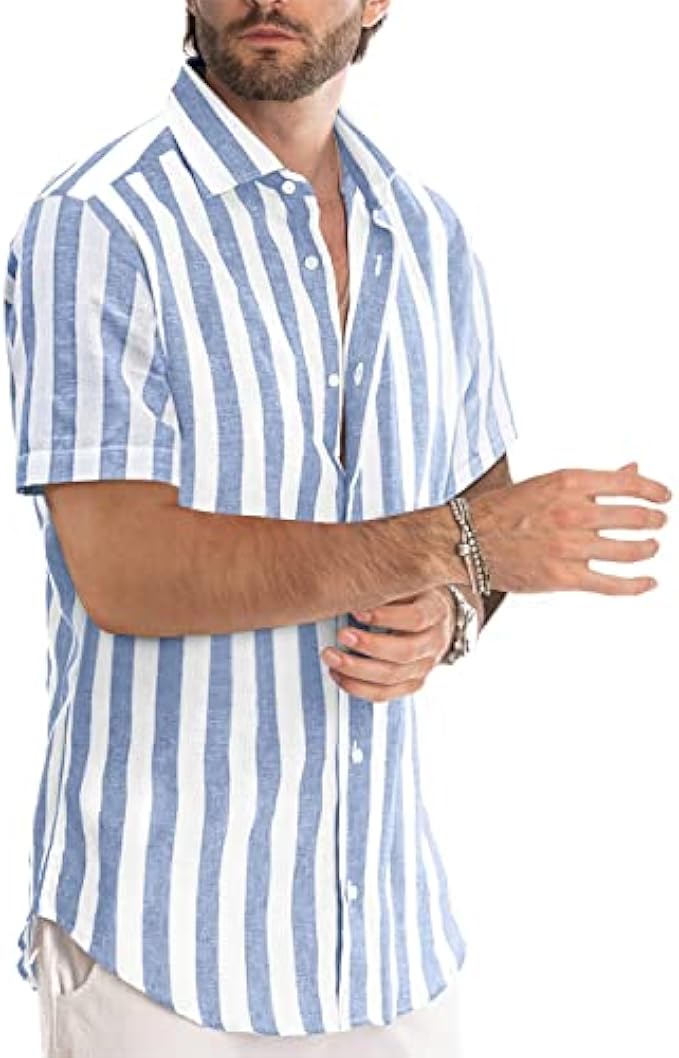 65%Polyester+35%Cotton(It has the look and feel of a linen,Soft and Breathable) S=(US 38), M=(US 40), L=(US 43), XL=(US 46), 2XL=(US 50), 3XL=(US 52), 4XL=(US 56), 5XL=(US 60) Button closure Machine wash or hand wash, no shrinkage after washing. Fabric: 65%Polyester+35%Cotton, soft and comfortable. You May Wear The Shirts As Dress Shirts Or As Casual Shirts, All Up To Your Personal Like. Design: Stylish casual short sleeve stripes button down shirt. This wardrobe-essential shirt features an easy, flattering fit. Perfect gifts for your boyfriend, son, husband, and yourself. Occasion: cruise, resort, office, work out, casual wear, outdoor, beach vacation, perfect to match with jeans or pants. Garment Care: Machine Wash Cold, Air Dry, Do Not Bleach. This lightweight fabric make it a great option year-round and never goes out of style. Package Content: 1 X Men's Shirts. Please Refer to the JMIERR Size Chart before Ordering, Not Amazon Size Chart.
