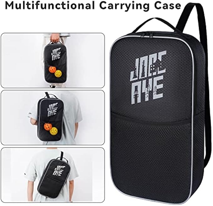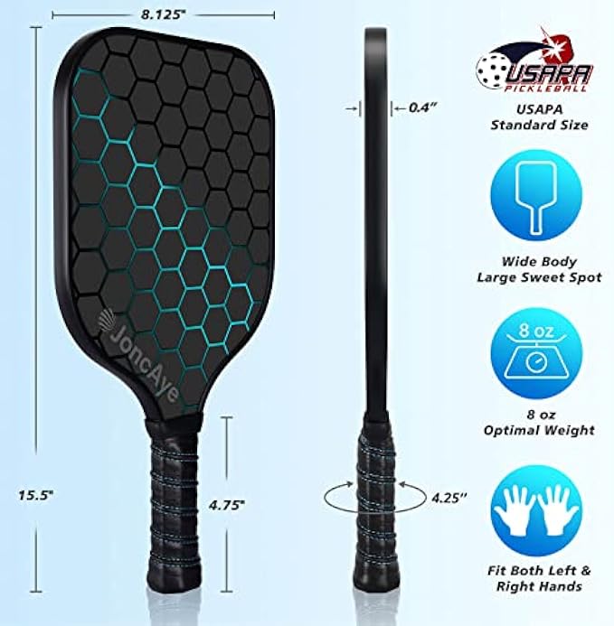 • ?? USAPA STANDARD SIZE WITH LARGE SWEET SPOT: JoncAye pickle-ball equipment is made in strict accordance with USAPA standards. This pickle ball raquette set of 4 has a wide paddle of 8 1/8 inches with a large sweet spot that will help you to reduce mishits. The dimensions of the pickleball racket are 15 1/2" L x 8 1/8'' W x 1/2''H including the soft edge guard that protects the advanced pickleball paddle from tear & wear