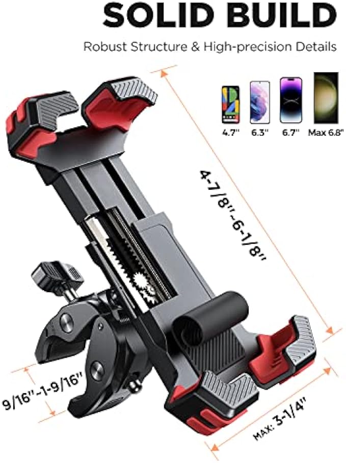 ?[ Full Protection ] The JOYROOM motorcycle phone mount features four corner protection and a non-slip silicone pad design to ensure your smartphone is securely fastened while riding, preventing it from slipping or sliding out of this phone bike mount. The powerful security lock ensures your phone stays securely locked in place at all times, with no risk of it coming loose or falling out. ?[ 1s Lock ] Still bothered by the difficulty of finding the safety lock on the back of the motorcycle phone holder mount? OR the difficulty of locking the safety lock in place? JOYROOM has designed the safety latch on the top of the mount, allowing you to lock/unlock the mount in the first place. ?[ Easy One-Handed Operation ] Just take 1 Second to put your phone into joyroom bicycle phone mount, without any complicated operations. This makes our bike phone mount more convenient to use while cycling, allowing you to keep your other hand free to operate your bike's controls. ?[ Freely Rotating ] JOYROOM phone mount for motorcycle features a flexible ball joint that allows you to easily adjust the angle of your smartphone for the best viewing experience while riding. The design also ensures that your phone's Face ID or fingerprint unlock function remains available without any obstructions. ?[ Strong Handlebar Clamp ] The bike handlebar clamp is fully upgraded, making it sturdy, durable, and universally compatible with handlebar from 0.59” to 1.57”(15-40MM), you can also use it on ATV/UTV, scooter, stroller, peloton, etc. Quickly and easily attach the holder to your bike without the need for any additional tools or equipment. ?[ Wide Compatibility ] This universal bike cell phone holder can fits 4.7 - 6.8" phones. The max opening is about 6-1/8"x3-1/4" (6.13x3.25inch), like iPhone 14/ 13/ 12/ 11 Pro Max, Pro, iPhone 14 Plus, iPhone Xs, iPhone XR, X, 8 Plus 7 6s 6, Galaxy S23, S23+, S22, S21, S22, S10, Note, LG and more. ?[ What You Get ] Come with a 2-Year warranty, Please feel free to contact us if you have any questions. Our reliable customer service will reply to you within 12 hours and offer you a suitable solution