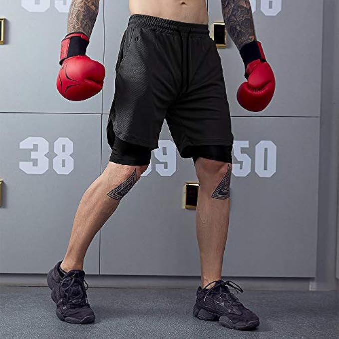 2-IN-1 DESIGN: Outer layer of this mens workout running shorts is 100% polyester mesh fabric, perfectly anti-pilling and breathable. The built-in workout shorts compression liner is 20% spandex and 80% polyester, elastic and skin-friendly enough for muscle healing.