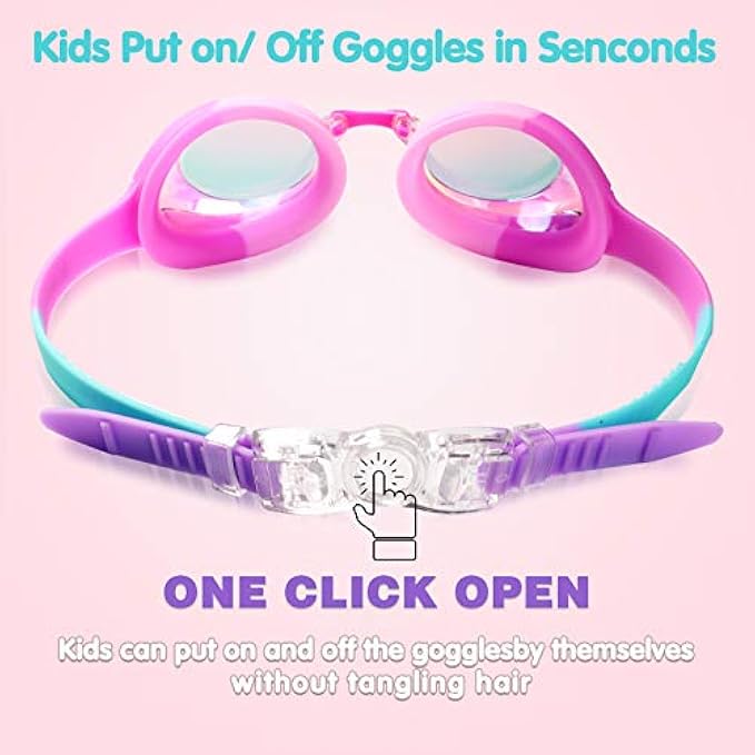 ?♂️【ONE BUTTON CLICK】Super easy to adjust for kids & youth! Keary goggles‘ Well-designed clasp makes it easy to put swimming goggles on and off through one press without tangling your hair. The upgraded button is more robust to prevent breakage. The Anti-slip strap can ensure the goggles remain in place during swimming.