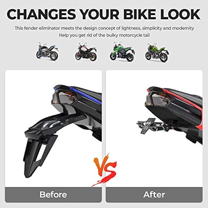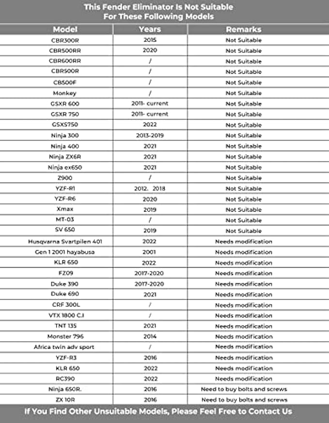 【Warm Tips】 The adjustable range of the mounting hole is 30~115mm, fender eliminator almost compatible with all of the models. But does not compatible with Ninja 1000, YZF-R1, 2020 cbr500rr, 2011- current gsxr 600/750, cbr600rr, cb300r, yzf600r, z125, 2020 zx6r. Please check the dimensions from the picture before you bid it. Use blue threadlocker(like LOCTITE) to keep the motorcycle tail tidy away from vibration or loose.