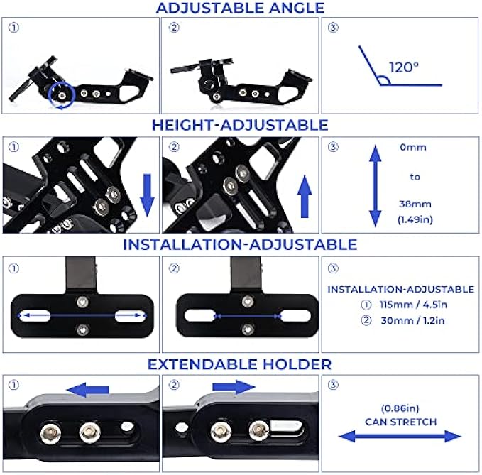 【THREE ADJUSTABLE FUNCTIONS】Motorcycle License Plate Bracket can adjust the horizontal angle different from the ground for getting the best view of road legal. Universal fender eliminator with length adjusts function help to avoid scratching the exhaust or rear seat. The installation position of the license plate can be moved up and down, choose a suitable installation position to fit the different sizes of license plate.