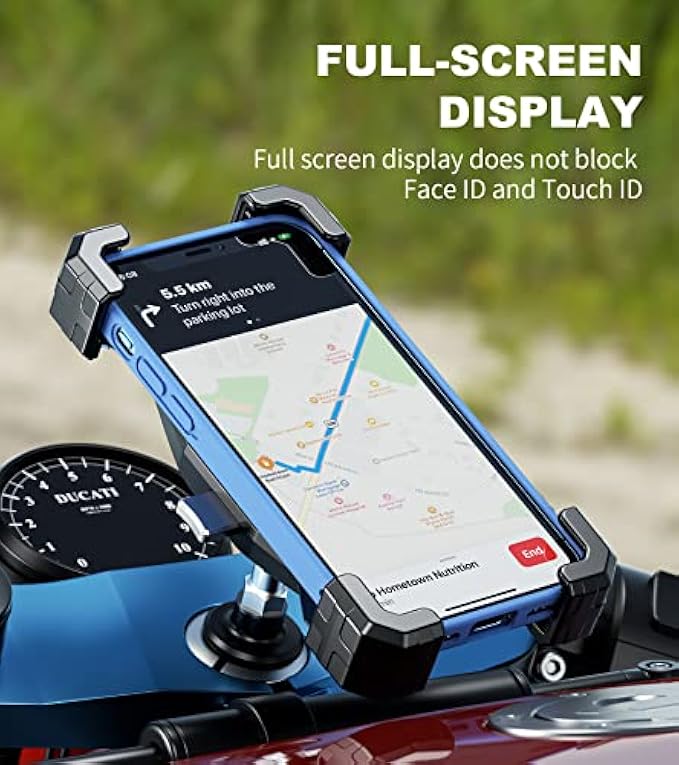 [ Sturdy and Safe ] A special shape design of this motorcycle phone mount can be wrapping four corners of your cell phone tightly. Adopts stainless steel telescopic arms, TPU ball and stainless steel fork stem, super sturdy! The motorcycle fork stem mount holds your phone perfectly even riding on a bumpy road.