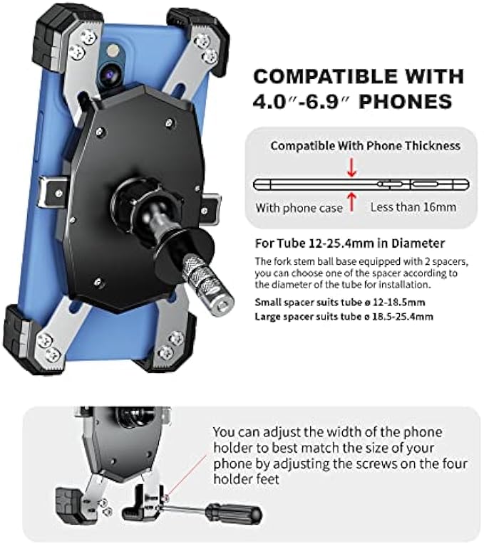 [ Wide Compatibility ] The motorcycle fork stem phone mount compatible with 4.0 -6.9'' celltphone. Fit for mobile phone thickness less than 16mm.