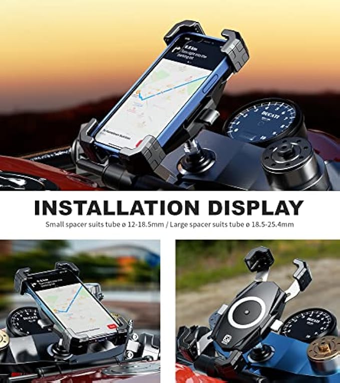 [ One-handed Operation ] The motorcycle fork stem phone holder adopts one-touch automatically lock and quick release design. Put in or take out your phone with just one hand in one second, very convenient. 360 degree free rotation design, can be easy to adjust the mobile phone to horizontal or vertical screen. Enjoy a free and easy riding.