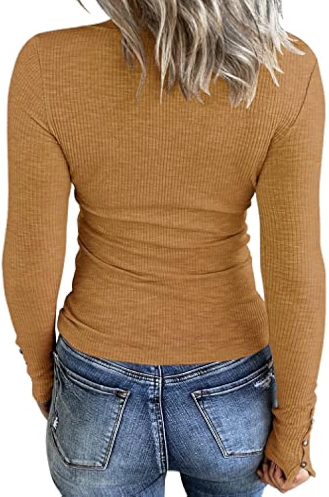 KINLONSAIR Women’s Long Sleeve Henley T Shirts Button Down Slim Fit Tops Scoop Neck Ribbed Knit Shirts