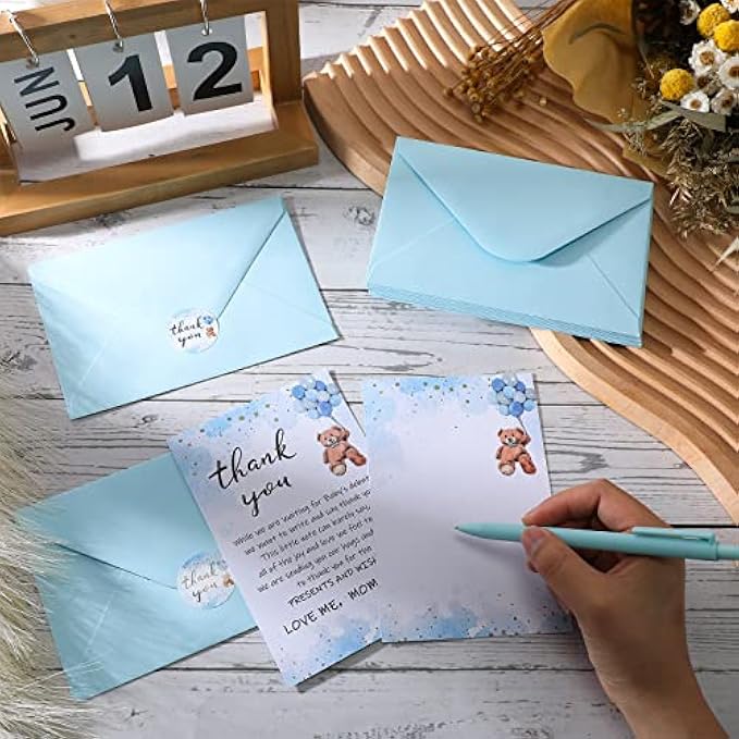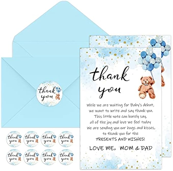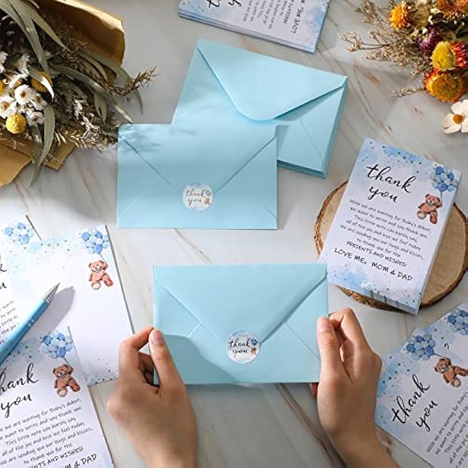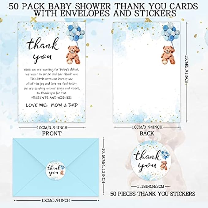 • What You Can Get: you will receive 50 pieces of bear baby shower thank you cards, 50 pieces of blue envelopes and 2 sheets of baby shower thank you stickers, each sheet contains 25 pieces of stickers, 50 pieces of stickers in total; Sufficient quantity can meet your using in the baby shower party