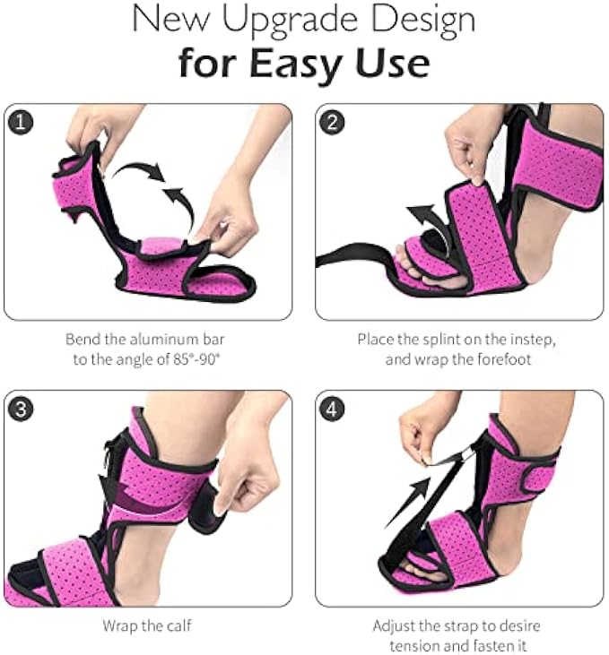 Super Easy Use with Only 4 Steps: The traditional plantar fasciitis night splints on the market are extremely difficult to figure out how it supposed to go on your foot because there are so many straps. But with our new design night splint, you can super easy to wear it with only 4 steps - - - 1. Bend the aluminum bar to the optimum angle of 85°-90°. 2. Wrap your forefoot. 3. Wrap your calf. 4. Adjust the dorsiflexion strap to desire tension and fasten it.