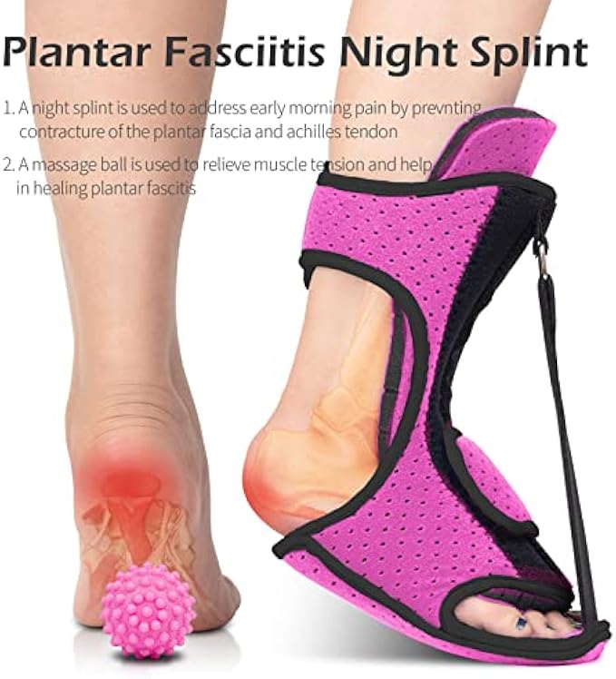 Plantar Fasciitis Night Splint & Massage Ball: Are you suffering from different degrees of foot pain, plantar fasciitis, achilles tendonitis, drop foot, flat arch or heel spurs? Our plantar fasciitis night splint will keep your foot stretched all night and alleviate these painful symptoms effectively. The massage ball will relieve muscle tension and help in healing plantar fasciitis or the pain and inflammation in the heel and the bottom of the foot by rolling it under your feet. Monystalia