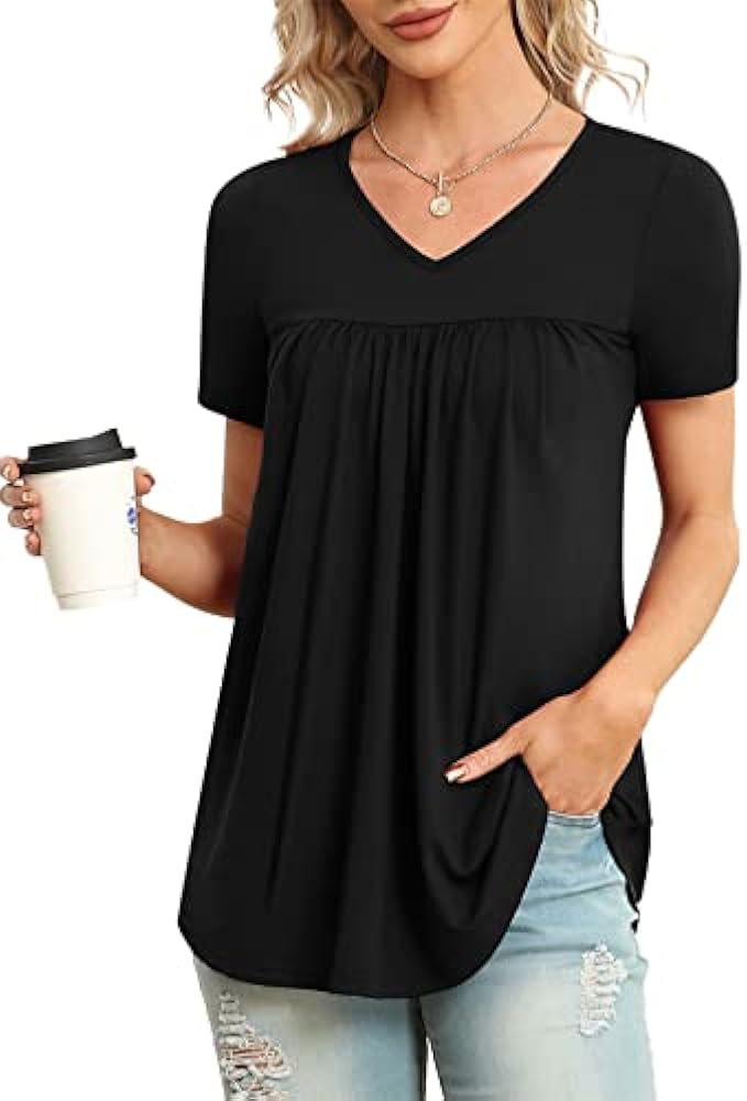 • 【 Chic Design 】 Casual style top, V Neck tunic, chest splicing, wrinkle design, short sleeve Tshirt, solid color and printing, horn shaped hem. This is the perfect balance of practicality and fashion. And with its loose and flowy design, it's great for hiding your stomach and creating a slimming effect.