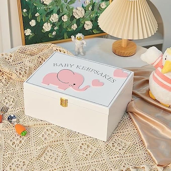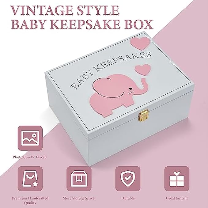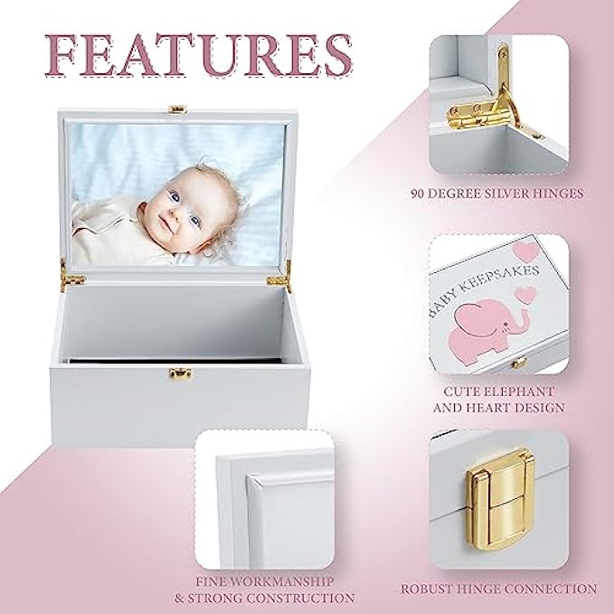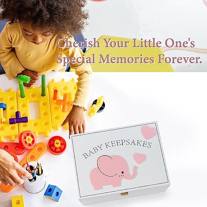 • A Cherished Home for Your Baby's Milestones - Our Baby Keepsake Box is more than just a storage solution; it's a heartfelt tribute to the precious moments of your little one's journey. Crafted with love and attention to detail, this wooden box features a stunning 3D pink elephant and heart design on the lid, capturing the essence of joy and love. It measures 5.3 x 8.6 x 11.7 inches, providing ample space to store and protect your baby's most treasured memories.