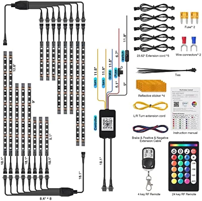 【New Design & High Brightness Led】 We this RGB motorcycle led light kits, with brake light warning function and turn signal function. Three ways to control flashing light strip kit 16 million colors and more than 20 modes and music modes.motorcycle LED light strips uses high brightness SMD5050 RGB LED SMD beads and fully sealed potting technology, very bright and IP68 waterproof. The convenient on/off button design allows you to turn off the light without powering off. 【Safety Brake Warning & Turn Signal Function】 When you apply the brake, all Motorcycle underglow led light kit will light up red and return to the previous setting when you release the brake; when you press the turn signal button, all LED strip light on the same side will flash amber. This is used to warn vehicles behind you and improve your driving safety. (Tip: Brake and Steering Functions Can Be Added or Not Added Optionally. And, when you are using this function, the remote control cannot control the light change) 【3 Control Methods & Switch Buttons】 motorcycle lights provides cell phone APP Bluetooth control and 2 easy to carry control IF + RF remote control, APP can DIY color, 29 mode selection, music mode and timing functions, etc. 2 24 keys / 4 keys RF remote control can control color change, mode change, music function. it is an easy way to control your bike lights. motorcycle strip has a convenient motorcycle handlebar switch button switch, no power failure can be turn off the lights. 【Easy to Install】 RGB LED lights has a super sticky tape on the back, which can be easily peeled off and stuck to any smooth surface. The LED strip lights can be bent to any angle and the strip can be cut to any size you want. We include six 23.62inch long extension cables to help you mount the LED strip anywhere on your motorcycle.The LED light bar is widely used on all motorcycles and cars with DC 12V power, Fit for motorcycles, Harley Davidson, Honda, Kawasaki, Yamaha, Dirt Bike, Snowmobile, cars, ATVs, bicycles, golf, trucks, off-road vehicles, Chevrolet, and other DC 12V power vehicles 【You will get】 6 x 3.93 inch + 6 x 7.87 inch + 4 x 11.81 inch LED strips ; 1 x 24Key RF remote ; 1 x 4Key RF remote ; 5 x 23.62 inch extension cable and spare fuse ; 1 x control box ; 1 x on/off button ; 4 x body warning reflective stickers (bonus). If you have any questions, please feel free to contact us, we provide reliable after-sales service 24 hours a day. 4 x 47 inch/3.93 ft extension cable: ASIN-B0BMVPCHJS