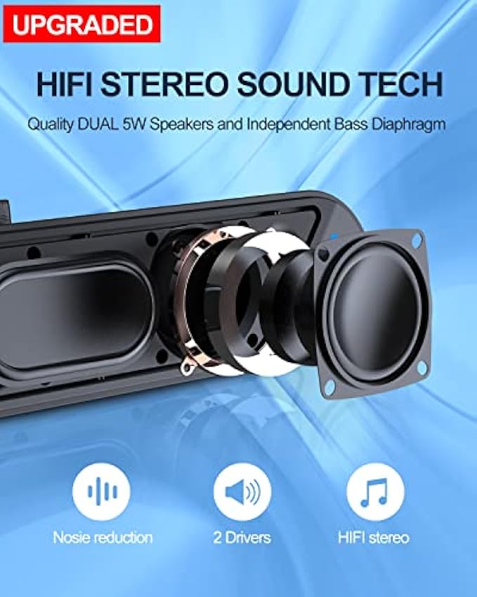 • Stereo and Noiseless:The PC speaker uses upgraded 2x5W technology to deliver the clear and crystal sound .The soundbar speaker can enhance your listening experience when you enjoying indoor movies, videos, music and games.