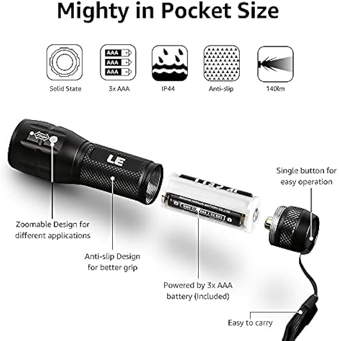 ZOOMABLE FLASHLIGHT- Led flashlight has ability to narrow or widen the area you wish to light. You can stretch the head-pulling zoom to adjust its focus and get spot beam or flood beam you need.