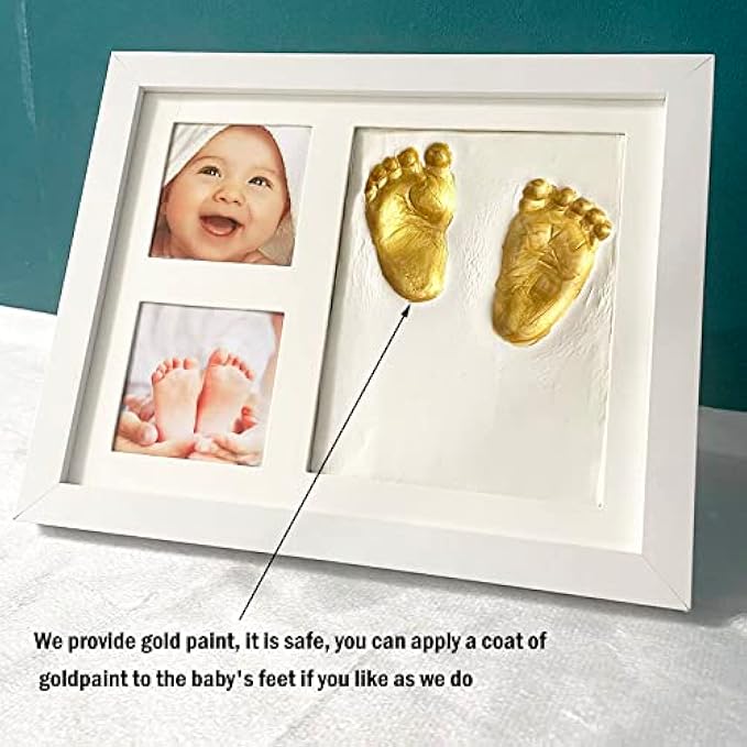 & Our baby footprint kit comes with gold paint and brushes, and if you like that color, you can use it to color the picture frame, and when it dries, you can use a writing tool to record important text messages,