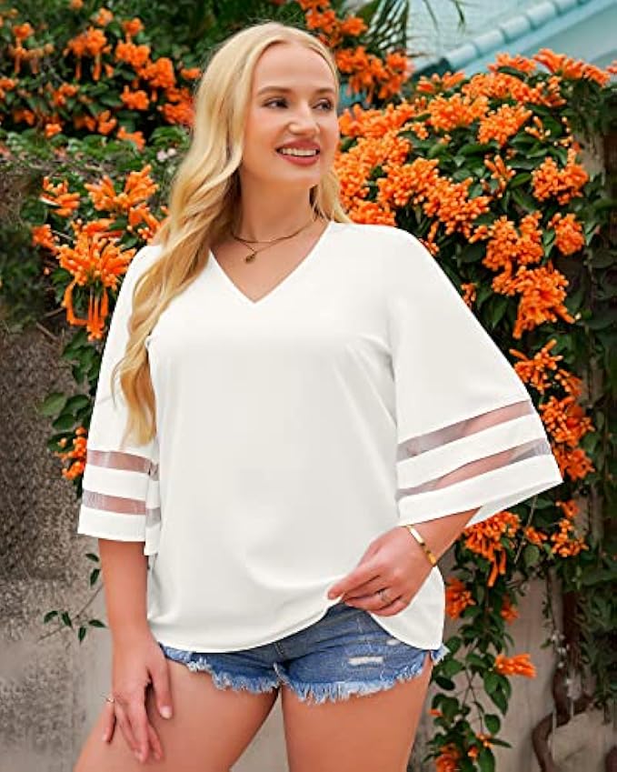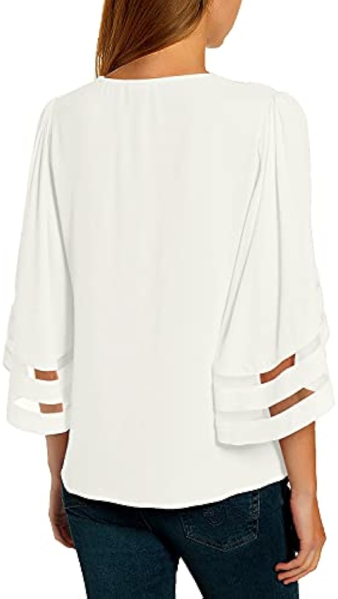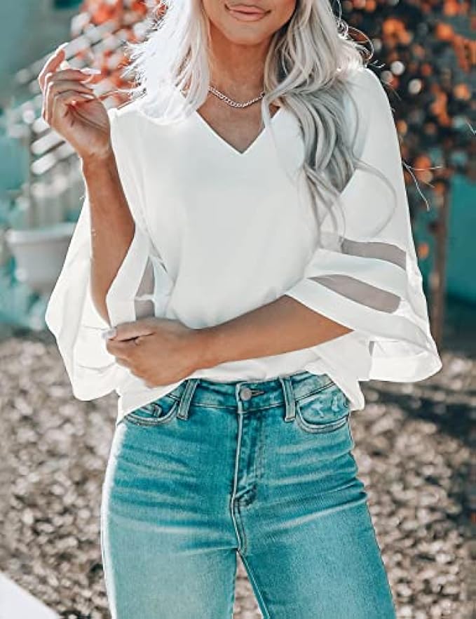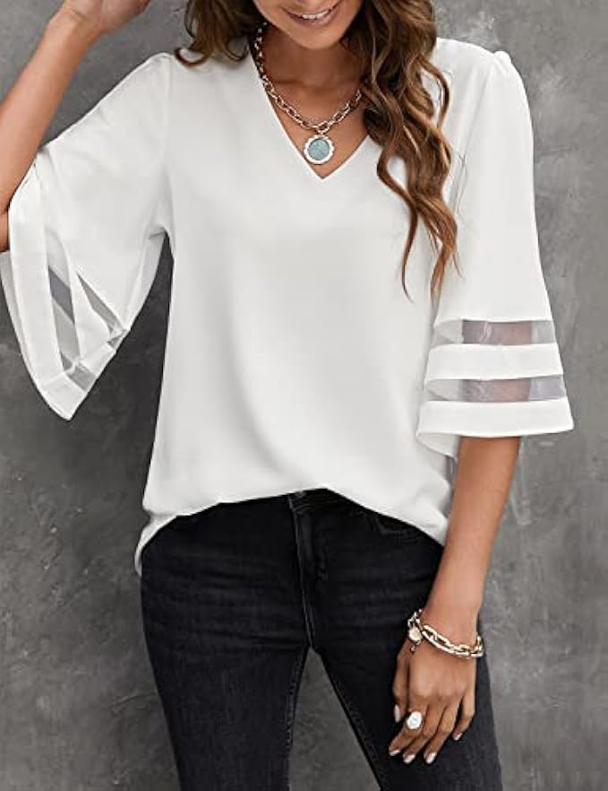 3/4 Flare bell sleeve. Solid color. Summer tops for women. Women summer tops. 3/4 sleeve chiffon blouses. Black work tops for women. Women 3/4 sleeve top, work shirts business blouses. LookbookStore womens v neck mesh panel blouse.
