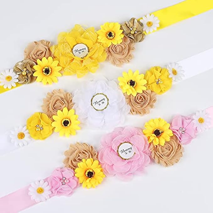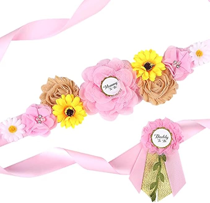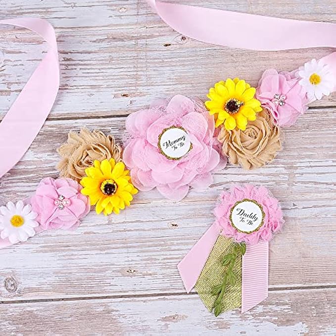 Lucky Summer Baby Shower Maternity Sash Mommy to Be Daddy to Be Corsage Pins Set Flower Belly Belt Photo Prop (Pink Sunflower)