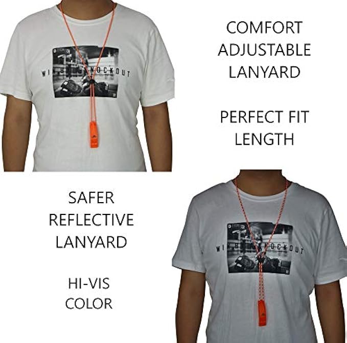 SUPER LOUD survival whistle: double tubes emergency whistle, high pitched powerful noise maker with dual sound chambers, can provide up to 120 decibel dB sound power, enough to be heard over a mile away. Cannot be overblown, works great as signal whistle. PEALESS DESIGN means no moving parts, nothing to obstruct sound, and nothing to jam, break or freeze. Lightweight and fail safe nice whistle works well in any conditions with excellent airflow design. Comfortable mouth grip, won't stick to lips like METAL ones in cold environments. ADJUSTABLE REFLECTIVE LANYARD and CLIP, high visibility even in the dark with slider button to adjust length around neck, long lanyards can easily loop through backpack, sailboats, camp hike gear, life jacket, kayak PFD, paddling paddle board, bike. You can also clip the whistle to your belt or shoulder straps for quick and easy use in case of emergency. SUPER DURABLE high impact ABS plastic construction ensures strong durability and complete waterproof moisture resistance. Premium quality whistles to carry for life safety, camping, hiking, backpacking, hunting, archery, fishing, swimming, boating, kayaking, marine sporting events any kind of outdoor activities, also for dog training. EASY-TO-REACH SERVICE, every purchase includes our worry-free warranty and lifetime support. If you have any questions, our friendly customer service team will be more than happy to help out.