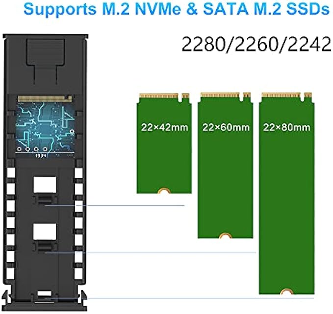 【COMPATIBILITY】Compatible with M.2 NVMe/SATA PCIe M key,PCIe B&M key SSD. Note: NVMe and SATA SSD are not included. NOT Compatible with M.2 PCIe AHCI SSDs, M.2 PCIe devices such as WiFi and capture cards, mSATA SSDs, and non-M.2 form factor SSDs. Applicable to sizes 2242 / 2260 / 2280 solid state drivers.