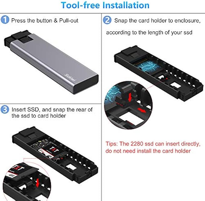 【TOOL-FREE DESIGN】Tool-free NVMe SATA NGFF enclosure allows quick and easy installation of your M.2 NMVe SSDs or M.2 SATA SSDs. The first time you use m.2 solid state drive SSD, you need to format the disk. It will Safe for your Memory data.