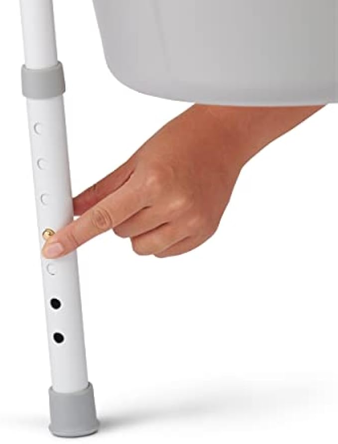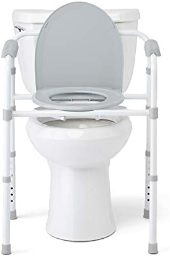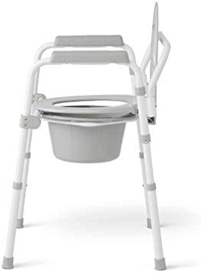Folding, height adjustable Medline bedside Commode with 7.5 qt commode bucket with carry handle, cover and splash shield; and durable plastic Snap-On seat and lid