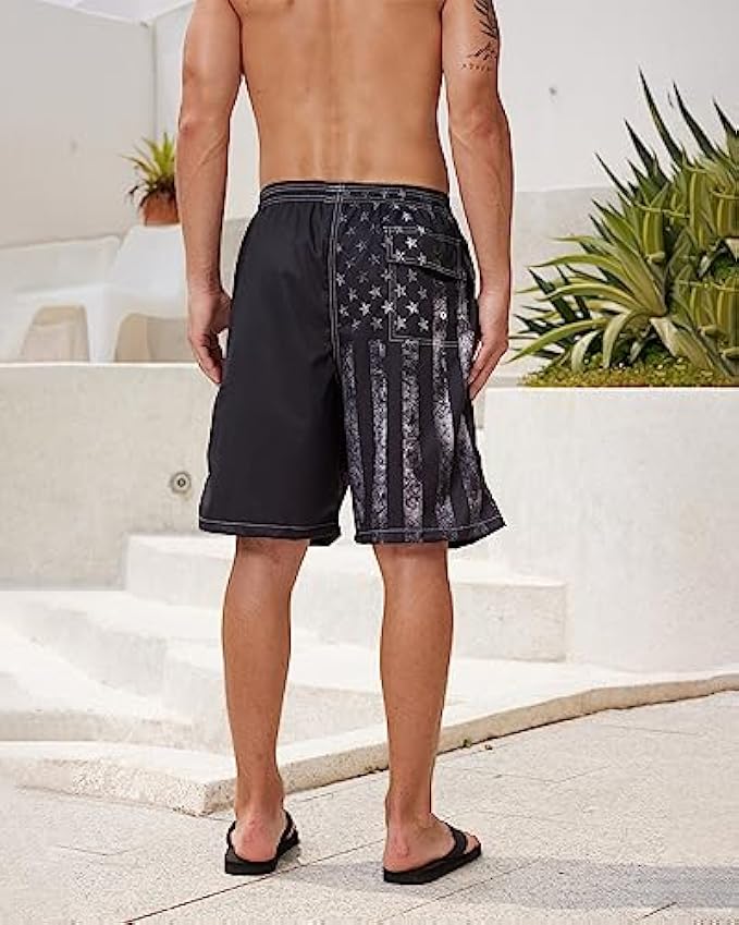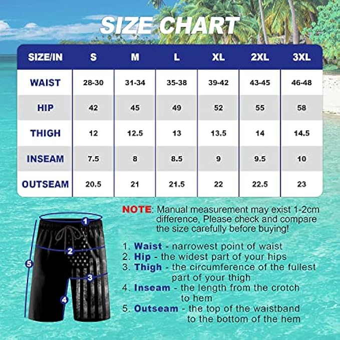 100% Polyester Polyester lining Drawstring closure Hand Wash,Machine Wash ⛱Mens Quick Dry Swim Trunks ⛱: 100% High quality polyester, wrinkle free, quick-drying, breathable, lightweight, safe, breathable, comfortable and skin-friendly fabric, can direct contact to skin. It has some useful characteristics, sweat-absorbing, quick drying, etc. Normally it takes 5 to 10 minutes, swim shorts have become dry already. ⛱Mens Board Shorts With Mesh Lining Design ⛱: All of our swim trunks are made with our comfort technology quick dry fabric with mesh lining. Elasticized waistband with drawstring can stretch and fixed the waist for comfort and adjustable. Mens swim trunks with pockets: the board shorts all get two beside pockets. It is mens elastic waist swim trunks and also mens drawstring swim trunks. ⛱Printed Swim Trunks for Men ⛱: These surf shorts can be worn in and out of the water during summer vacation. Our swim trunks using dye-sublimation technology that allows graphics lifelike, vibrant colors and comfy material will bring you a cool summer! (Machine wash or hand wash with cold water recommend,do not use bleach.) ⛱Surprise Vacation Gift ⛱: Ultimate sun protection, our mens swimming trunks provides upf 50+ which blocks the sun's harmful ultraviolet rays. It is suitable for various water activities such as Swimming, Surfing, Bodyboarding, Kayaking, Fishing, Rafting, etc. Nice gift ideal for your mens/ husband/ father in this summer. ⛱Mens Swim Trunks with Liner ⛱: The board shorts mens swimwear are suitable for swimming, beach vacation and sports, fitness, or for home etc and the American Flag swimsuits by our unique fashional stylish design are the best choice as men's swimwear.
