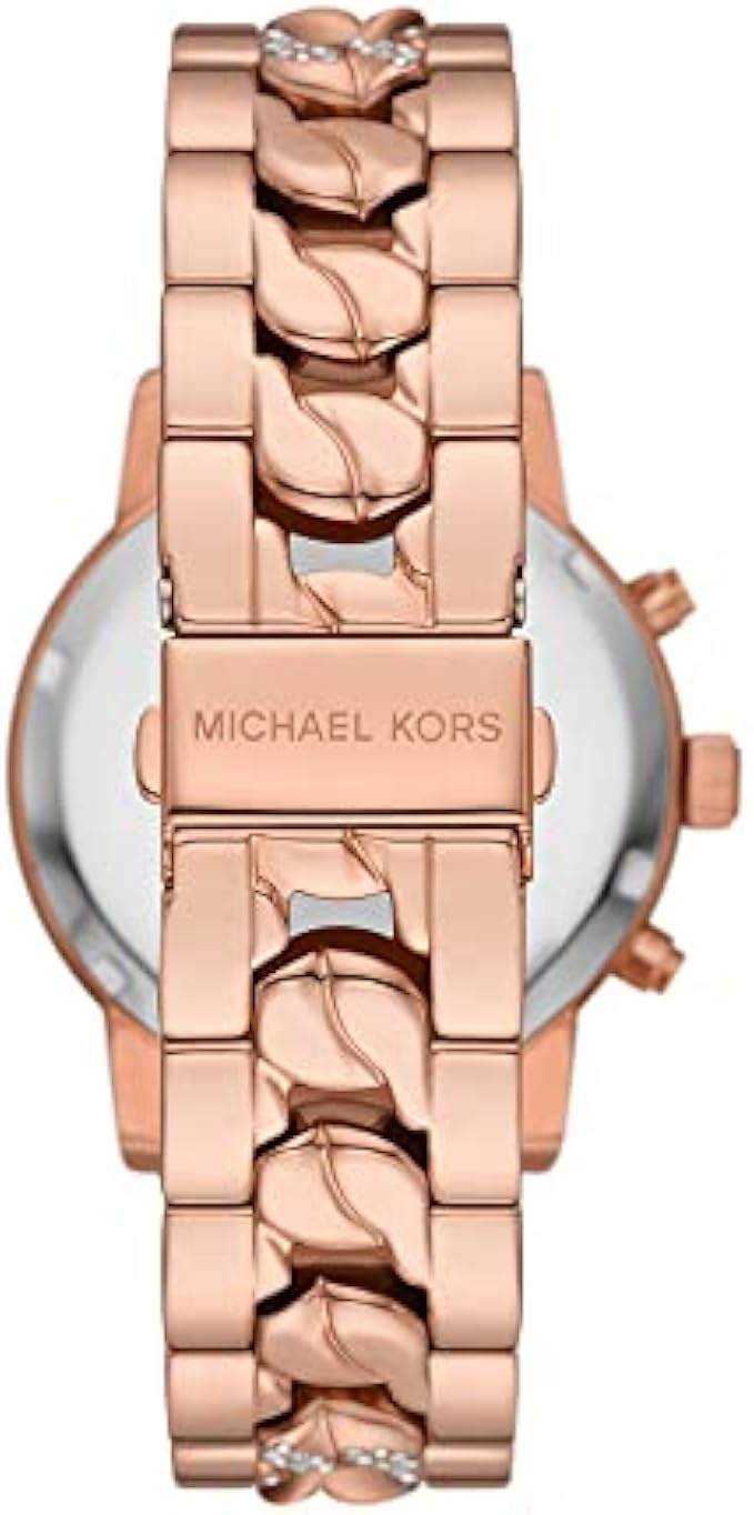• A sporty pavé curb chain is the center of attention on this 41mm Ritz. With chronograph movement and a pavé topring, this rose gold-tone sport watch has just the right amount of glitz.