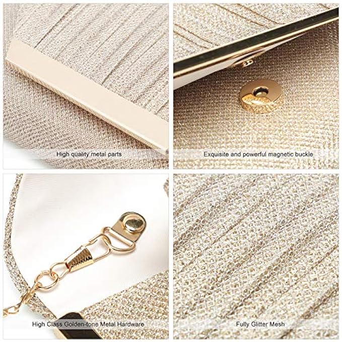 Feature:Main compartment has soft lining with 1 Magnetic buckle and 1 open side pockets Made up of sparkling mesh material gold metal alloy accents . The exquisite and elegant style made you 100% attracts lots of admiring glances.
